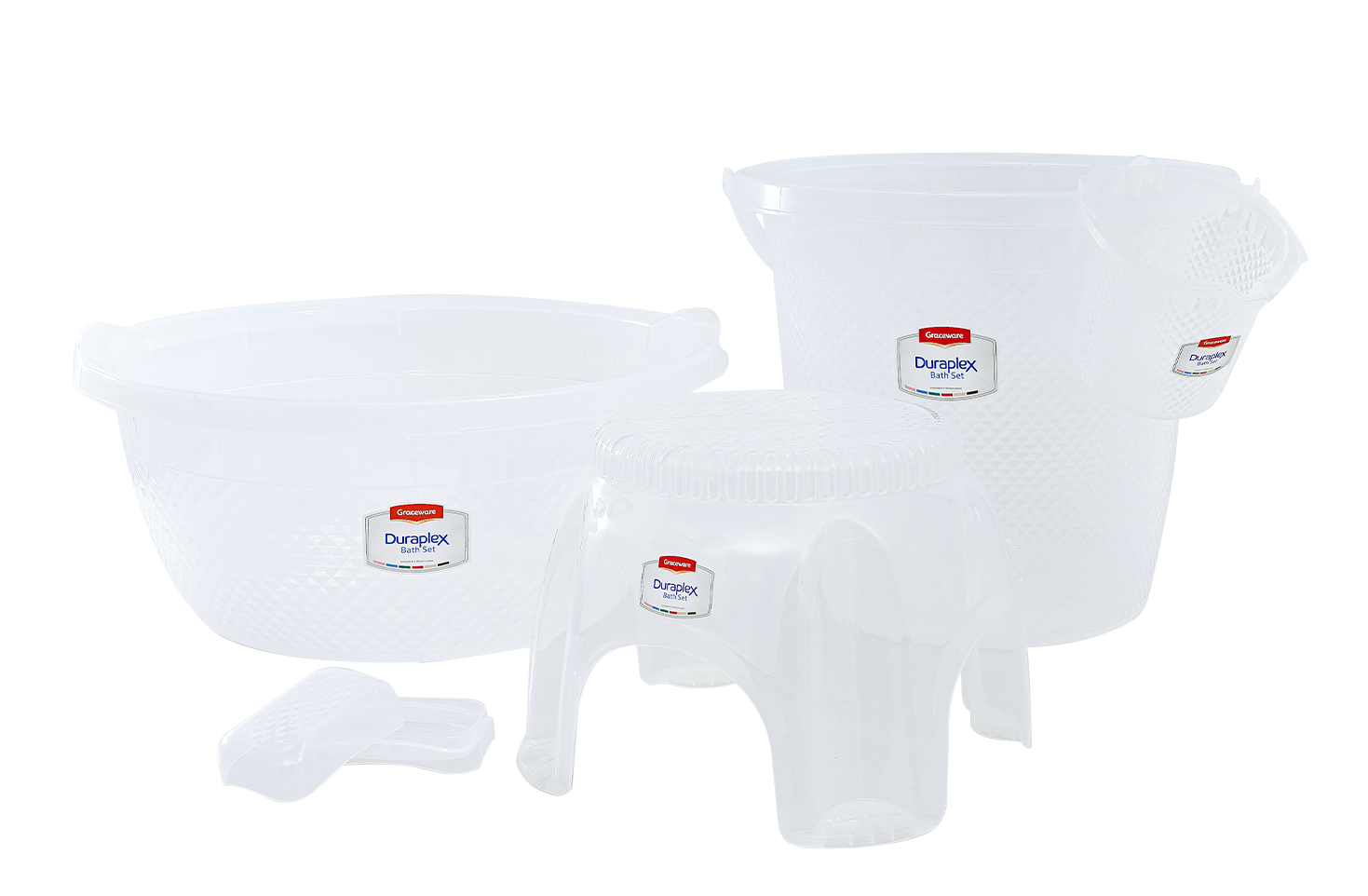 With its crystalline texture, the Duraplex Bath Set is a welcome addition to any bathroom. Offering optimal bath accessories that support a sturdy build and functional design. Add style and functionality to your bathroom with this five piece bath accessories set. Available in 5 vibrant colors. Made of highly durable and break resistant plastic.