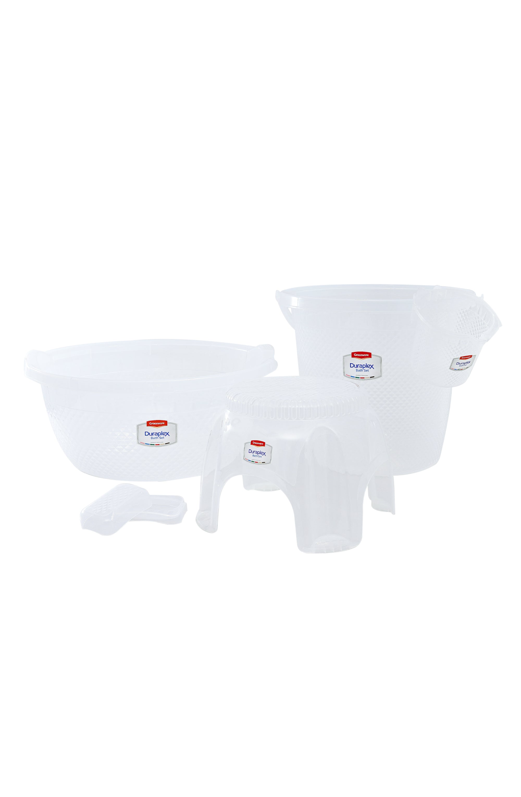 1x Bucket 1x Mug 1x Soap holder 1x Stool 1x basin tub